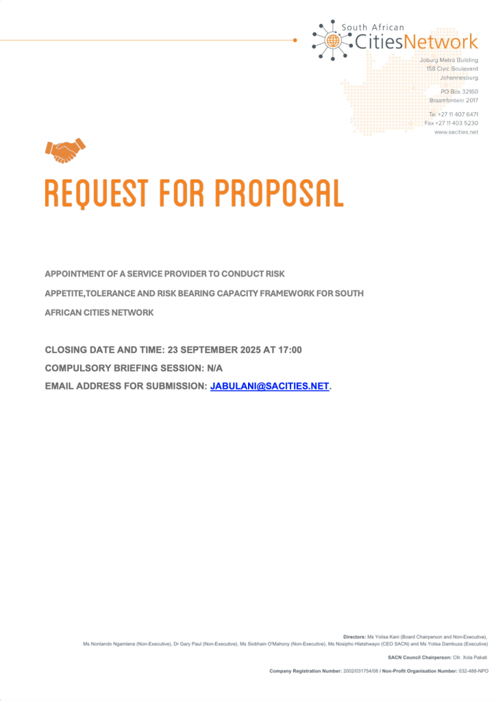 Request for Proposals (RFP)— For the appointment of a service provider to conduct a risk appetite, tolerance and risk-bearing capacity framework for the South African Cities Network (SACN).