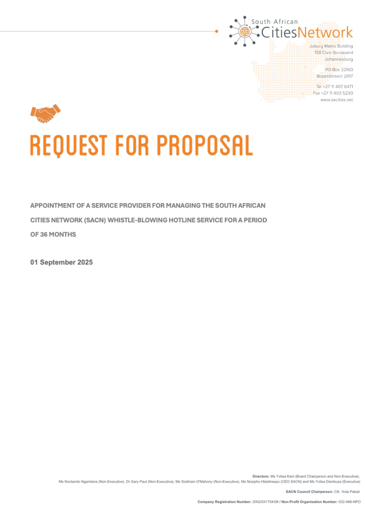 Request for Proposals (RFP)— For the appointment of a service provider for managing the South African Cities Network (SACN) whistle-blowing hotline service for a period of 36 months.